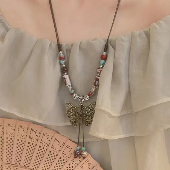 Retro Style Bohemian Sweater Chain Ceramic Beaded Butterfly Pendant Necklace Women's New Ethnic Style Long Necklace