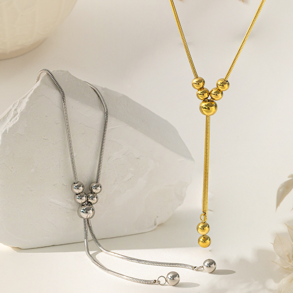 Japanese and Korean Minimalist Style Gold and Silver Round Bead Adjustable Necklace with a Sense of Design, Vintage High-End Long Sweater Chain