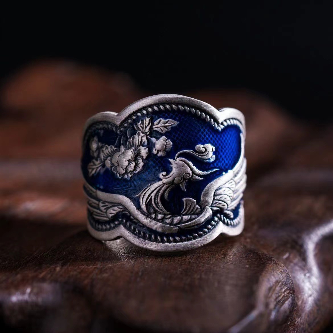 Burnt Blue Craft Peony Flower Phoenix Ethnic Style Open Ring for Women Retro Old Style Personalized Literary Index Finger Ring