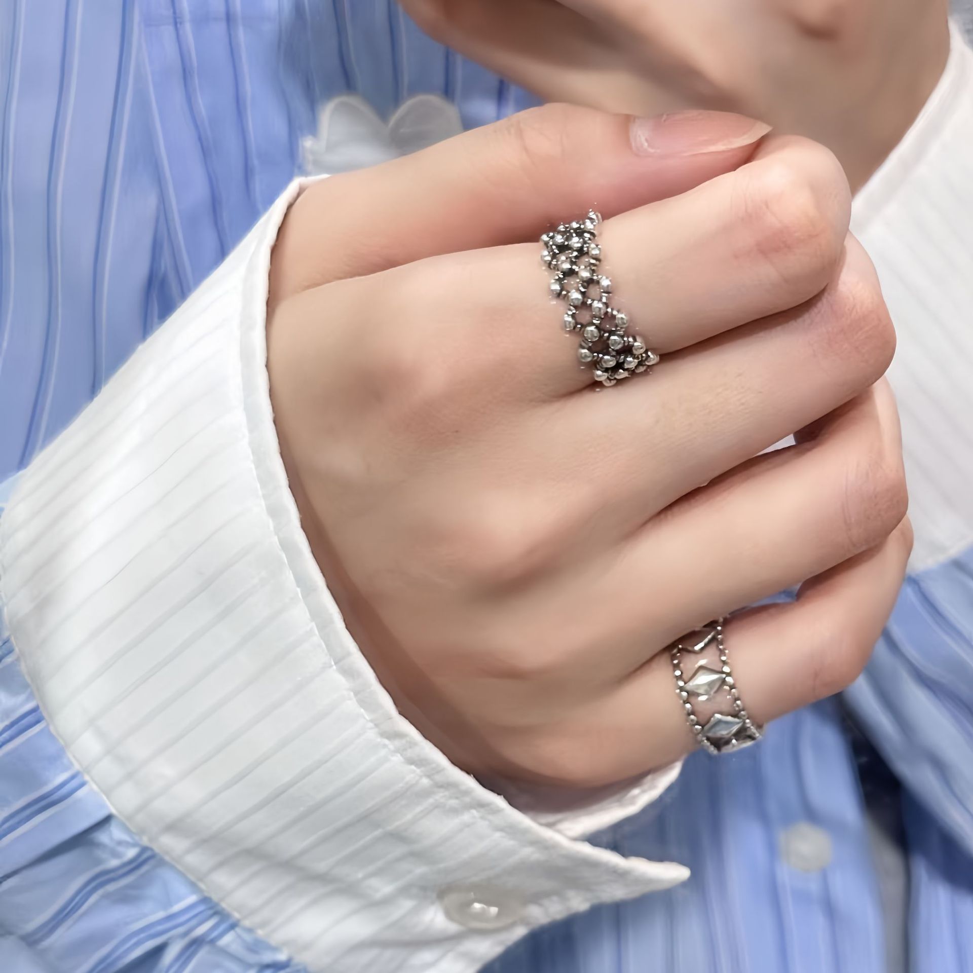 Evening Ornament Vintage Lace Grid Ring Women's Distinctive Niche Design Gris-shaped Tail Ring Ins Open All-match Finger Ring