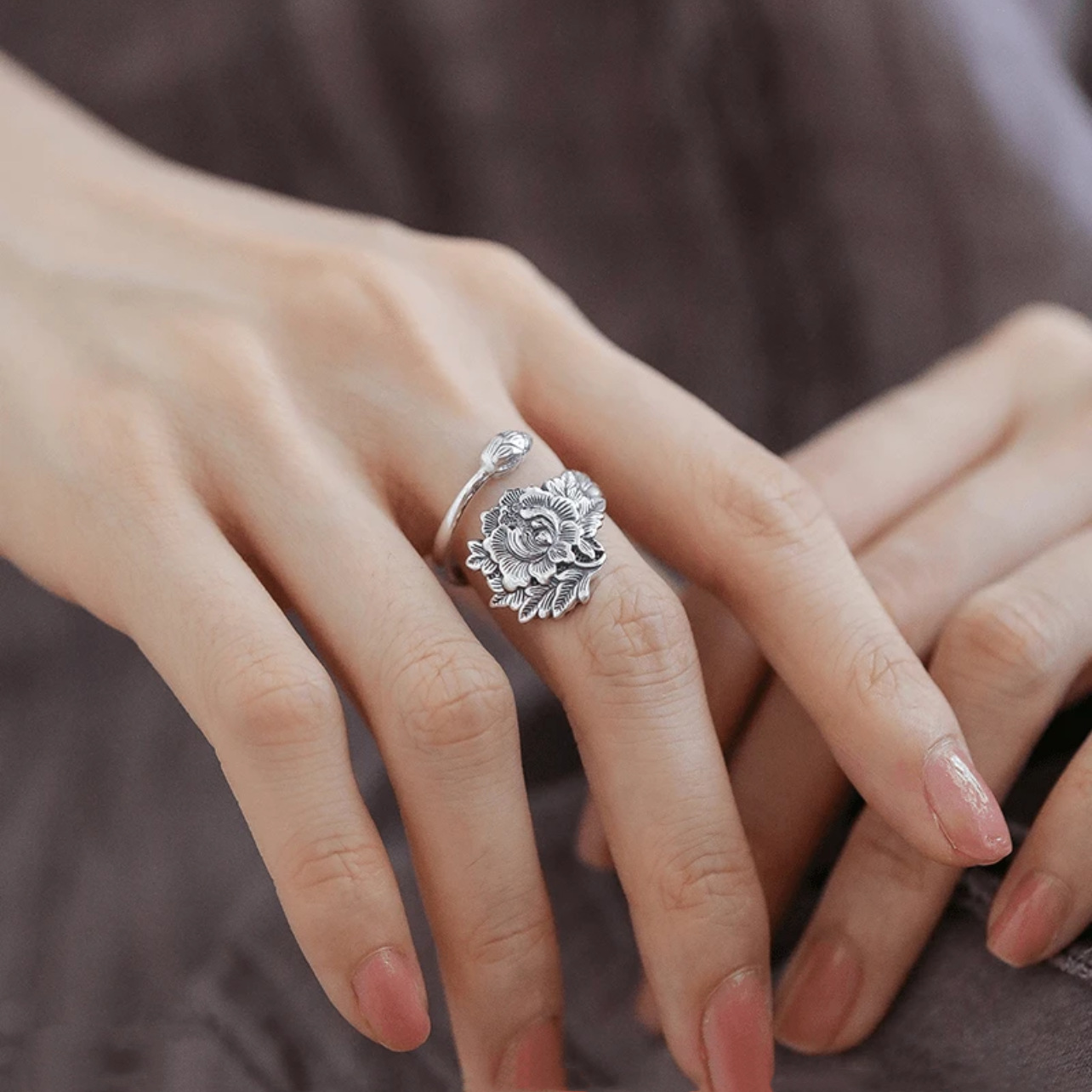 Peony Flower Twig Ring Women's Vintage Ethnic Style Handmade Classical Antique Style Vintage Style Adjustable Ring