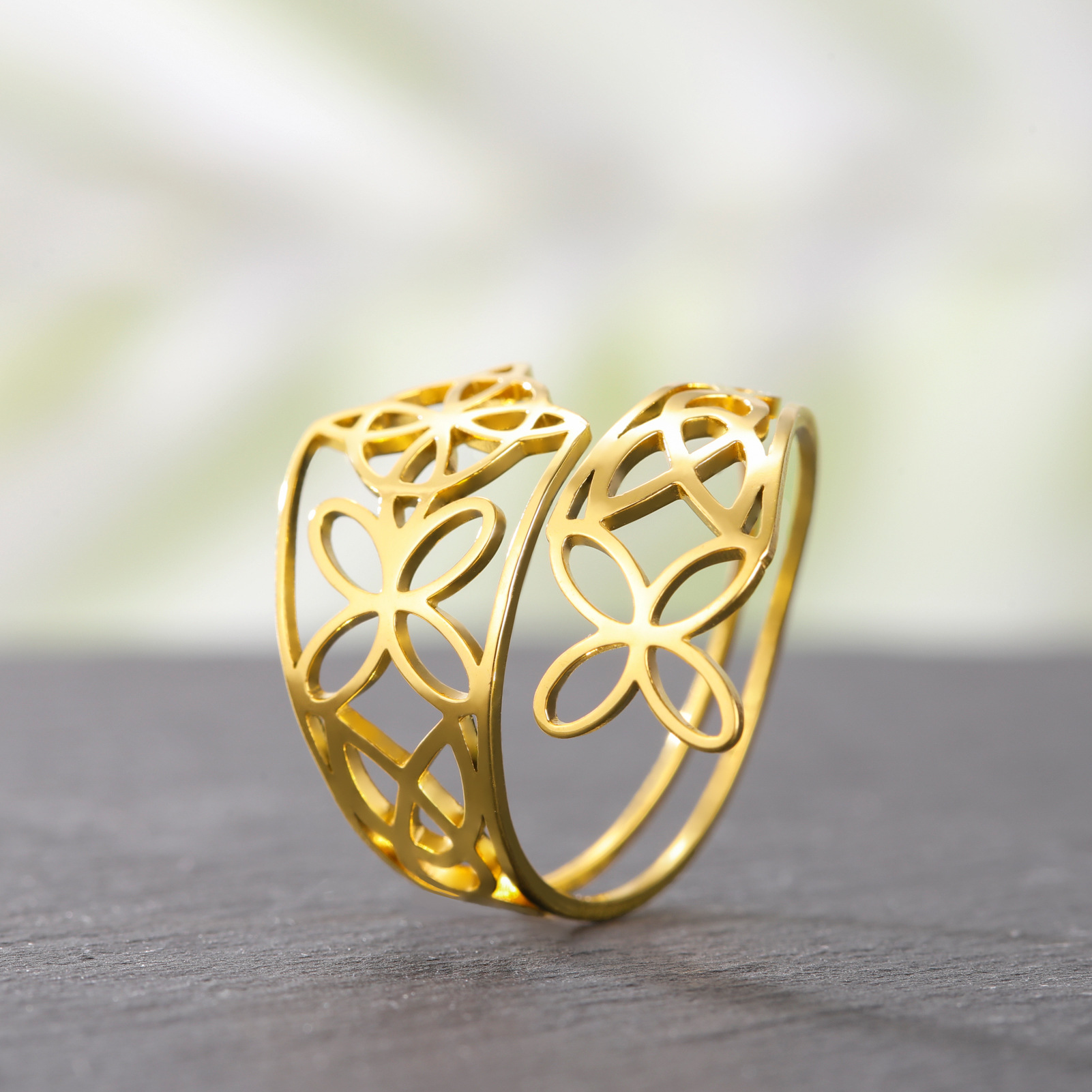 Europe and the United States popular new 18K gold plated vintage Nordic Viking stainless steel hollow witch knot petal opening ring