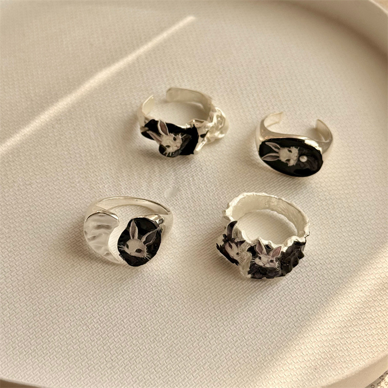 Guochao Handmade Enamel Black Oil Dropping Animal Bunny Ring Ancient Silver Irregular Opening Stacked Ring Ring
