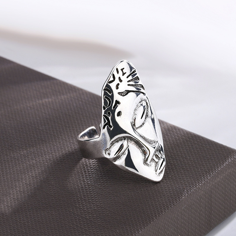 Creative abstract face ring European and American ins silver plated do old hip hop exaggerated personality index finger joint ring wholesale