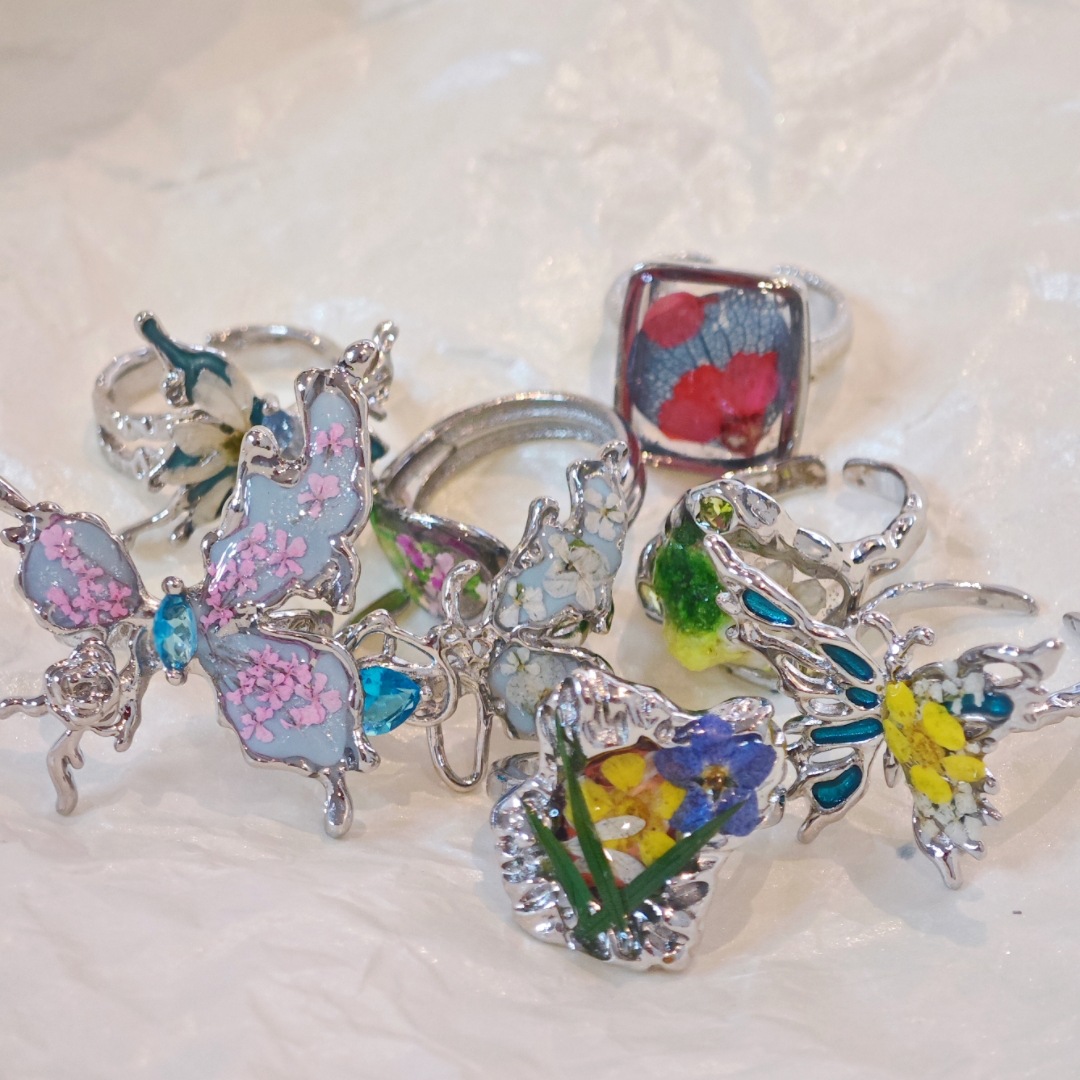 New Chinese Color Dried Flower Butterfly Flower Ring Vintage High Handmade Real Flower Open Finger Ring Jewelry