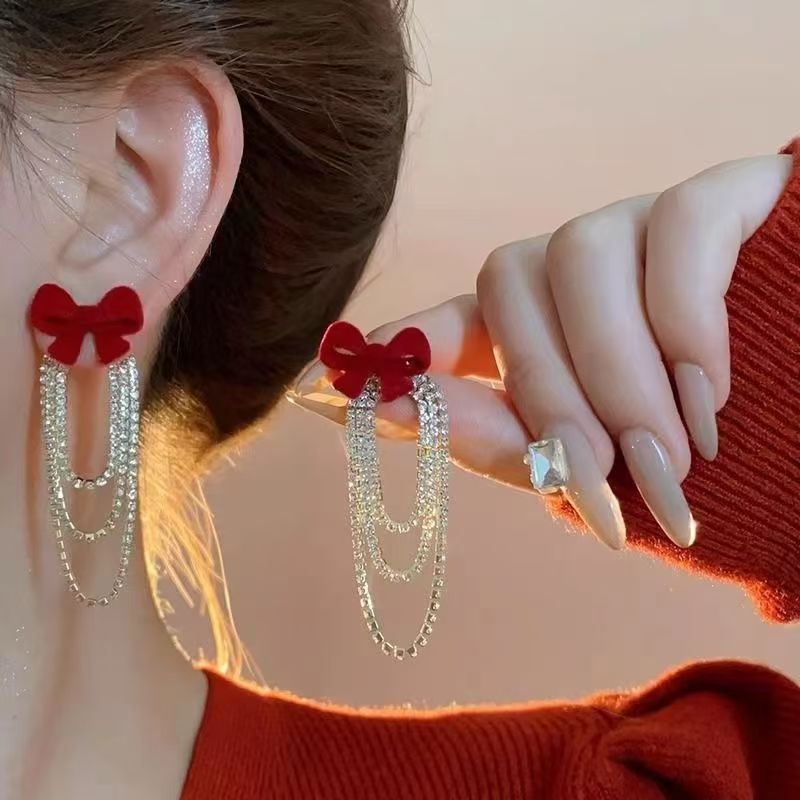 New Year flocking red flower earrings 2024 niche design high-grade earrings vintage tassel white earrings