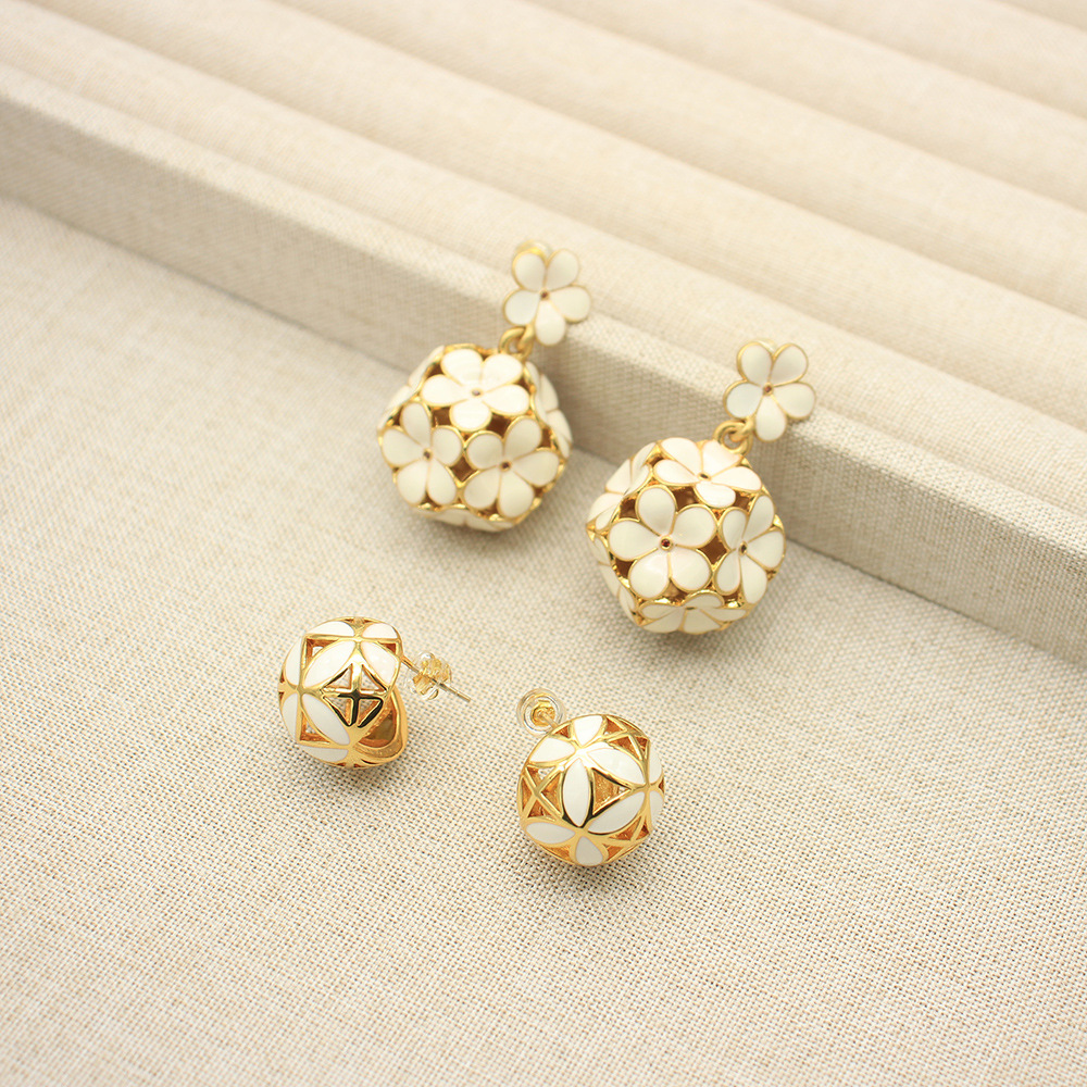 Qingdao Second-Hand Jewelry Factory Wholesale White Enamel Flower Ball Earrings Copper Plated Real Gold Color-Preserving Silver Needle Earrings for Women