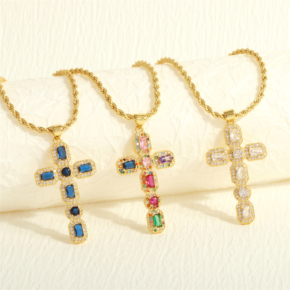 European and American personality hip-hop micro-inlaid colored zirconium cross necklace women's fashion trend plating 18K gold clavicle chain jewelry