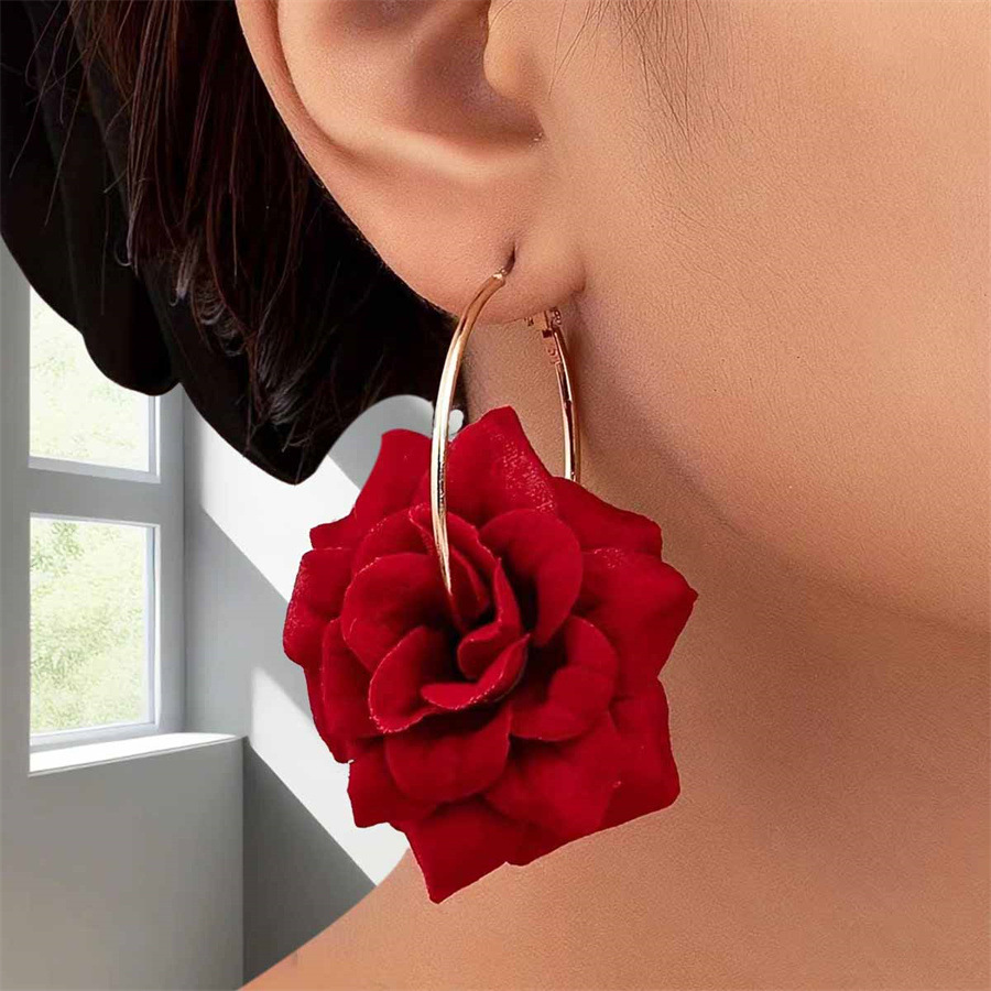 Hot-Selling Bright Red Rose Hoop Clip-On Earrings, Exquisite, Elegant, Gentle, Suitable for Vacation and Daily Wear