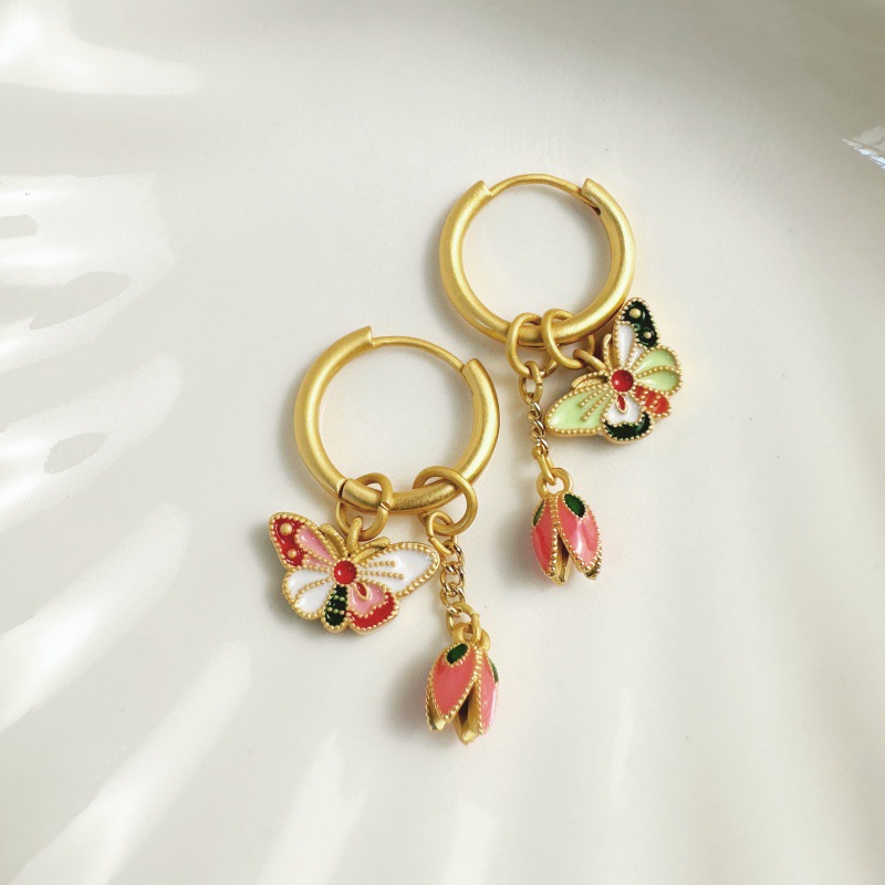 Vintage Sweet Oil Dropping Flower Double-sided Butterfly Ear Buckle Women's New Chinese Style Elegant Luxury Niche Unique Earrings
