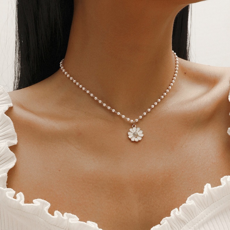 Korean Style Gorgeous White Floret Short Necklace Female Temperament High Cold Pearl Chain Drop Oil Chrysanthemum Pendant Clavicle Chain Necklace