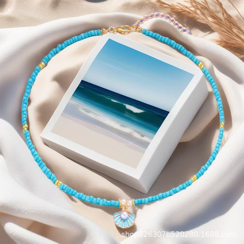 New European and American Bohemian Beach Vacation Style Alloy Shell Rice Bead Pendant Adjustable Necklace