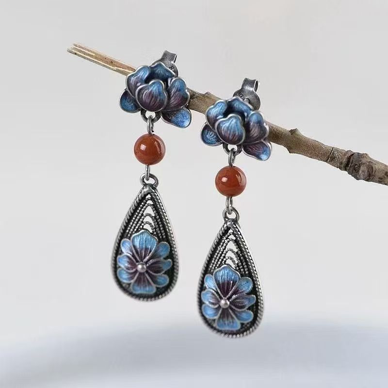 Cloisonné Magnolia Earrings Electroplated Silver Retro Peony Pearl White Jade Elegant Ladies Earrings Enamel