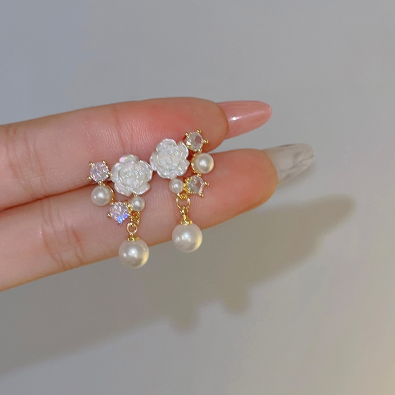 White Camellia Pearl Rhinestone Earrings for Women, Fresh, Sweet, Elegant, Small French Flower Earrings