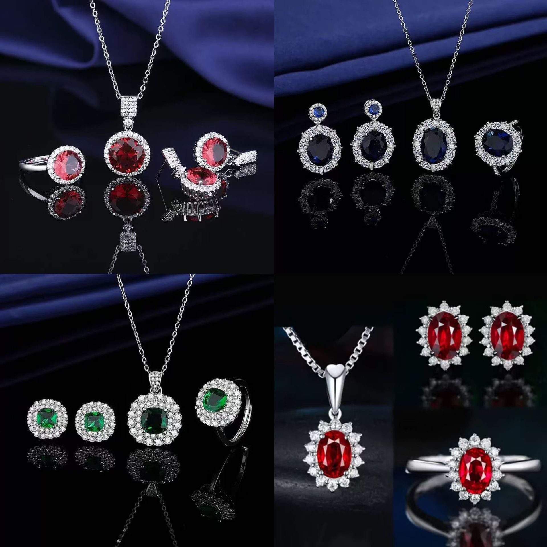 Amazon Foreign Trade Blue Red Yellow Green Purple White Gemstone Zircon Necklace Set Ring Earrings Pendant Women's Light Luxury High-End