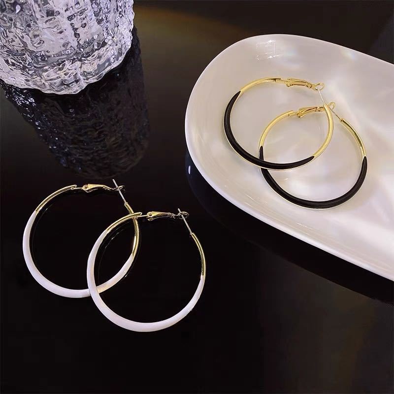 925 Silver Needle Ear Buckle Exaggerated Large Round Needle Ring Earrings Internet Popular High-end All-match Fashion White Oil Dropping Earrings Trendy