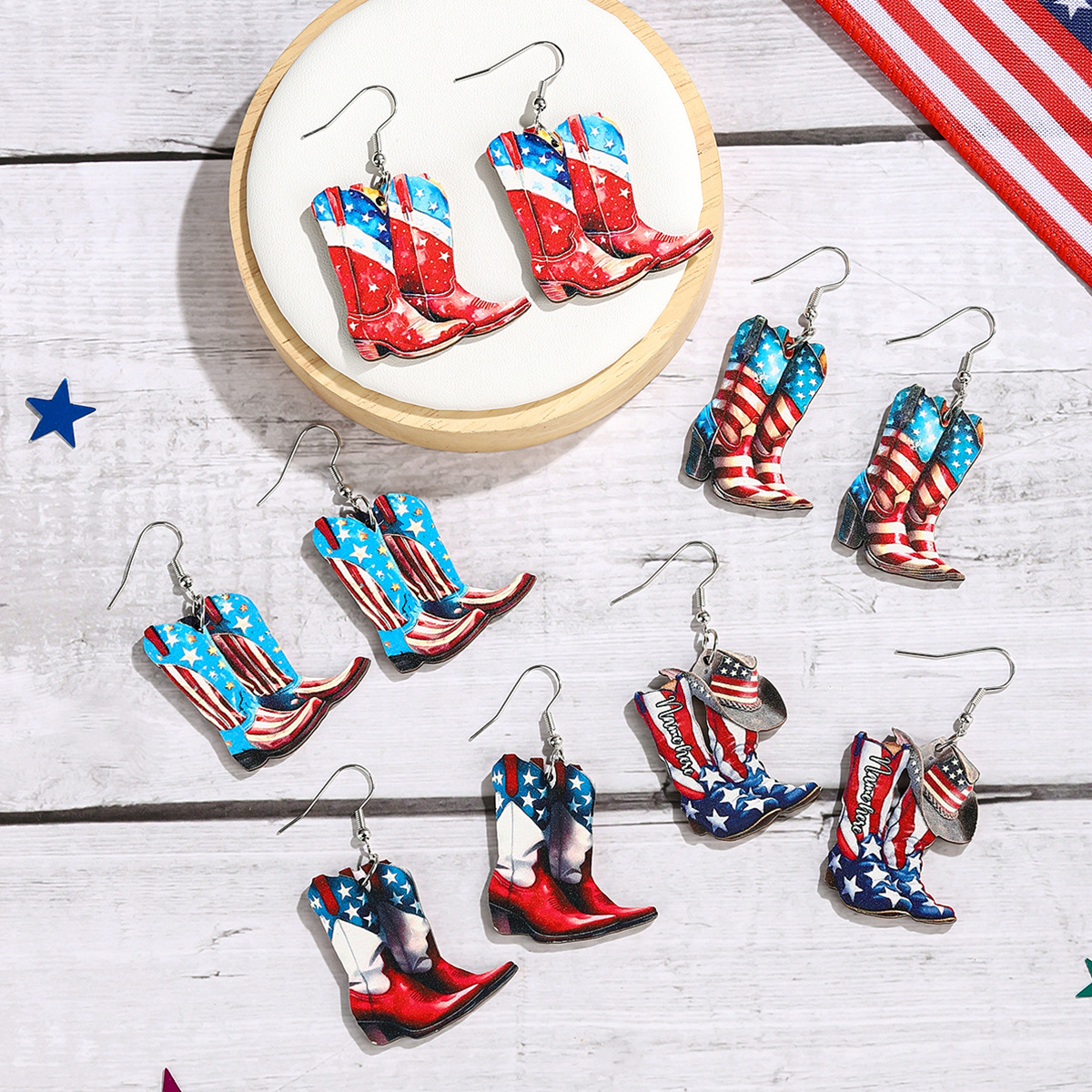 Cross-border New American Independence Day Element Wooden Boots Earrings Fashion Cowboy Hat Multicolor Stars Flag Earrings