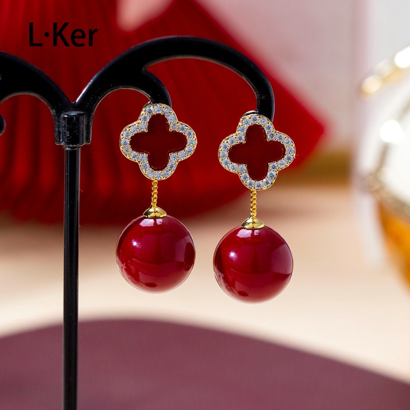 2026 Classic Red Four-Leaf Flower New Year Full Diamond Flower Earrings Light Luxury Elegant Women's Beaded Earrings 1826