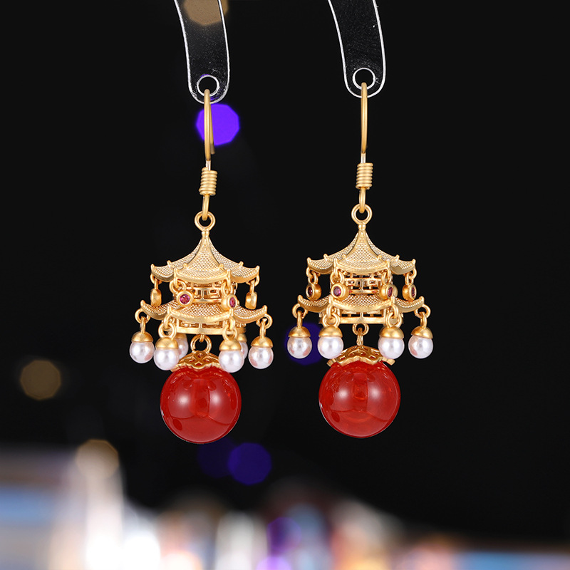 New high-end sense red agate pearl tassel antique earrings new Chinese high-end pavilion palace lantern palace wind earrings