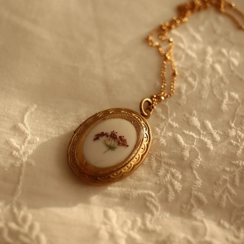 European and American Cross-Border Popular 14K Gold White Floral Dried Flower Photo Box Necklace Gold Border Niche Retro Style Necklace