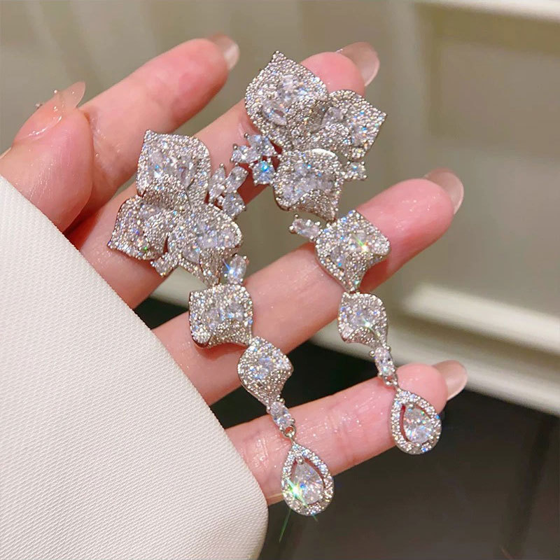 High-End Heavy-Duty Earrings Wholesale Annual Party Dinner Dress with Luxurious Long Elegant Zircon Flower Earrings