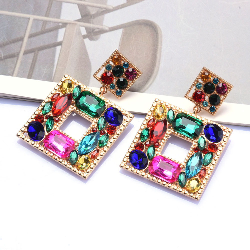 European and American fashion creative geometric colored diamond series alloy Diamond Square earrings personality female earrings cross-border wholesale