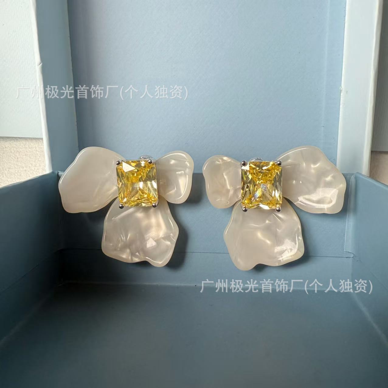 Hefang White Iris Sugar Cube Earrings Studs Ear Clips Light Luxury High-End Earrings Silver Needle Seamless Delivery