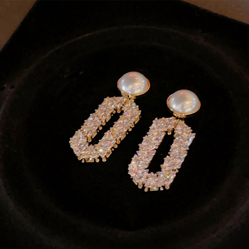 925 silver needle light luxury zircon hollow geometric pearl earrings slimming versatile elegant OL style sweet ear jewelry