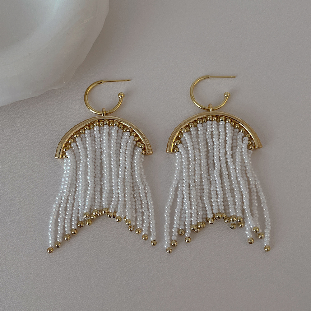 French retro design handmade white beaded tassel metal earrings female s925 silver needle European and American exaggerated earrings