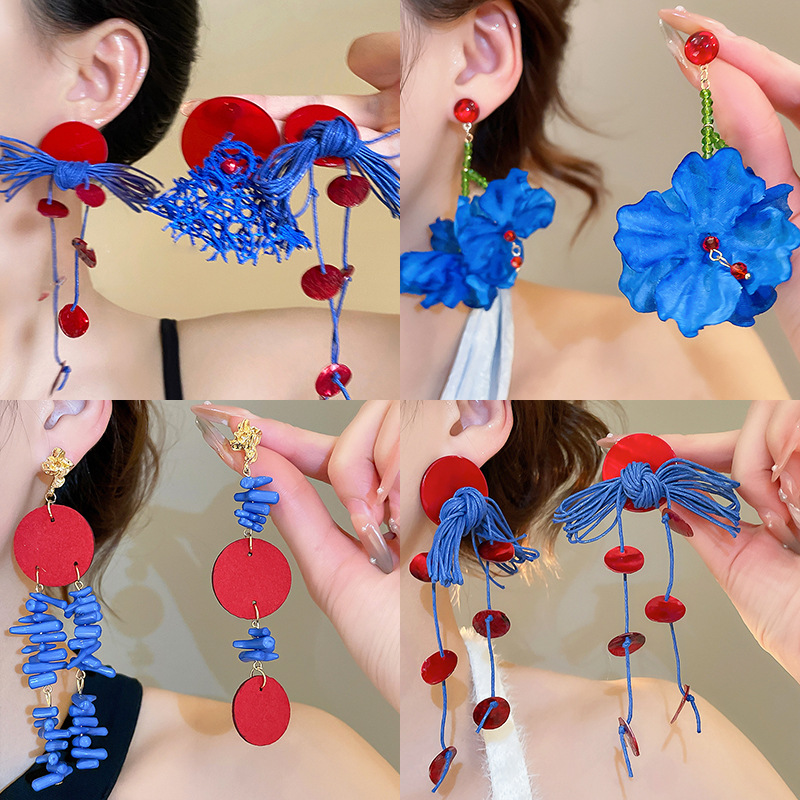 Klein Blue Chinese Style Flower Disc Tassel Earrings Accessible Luxury High-End Earrings Women's Earrings Design Niche