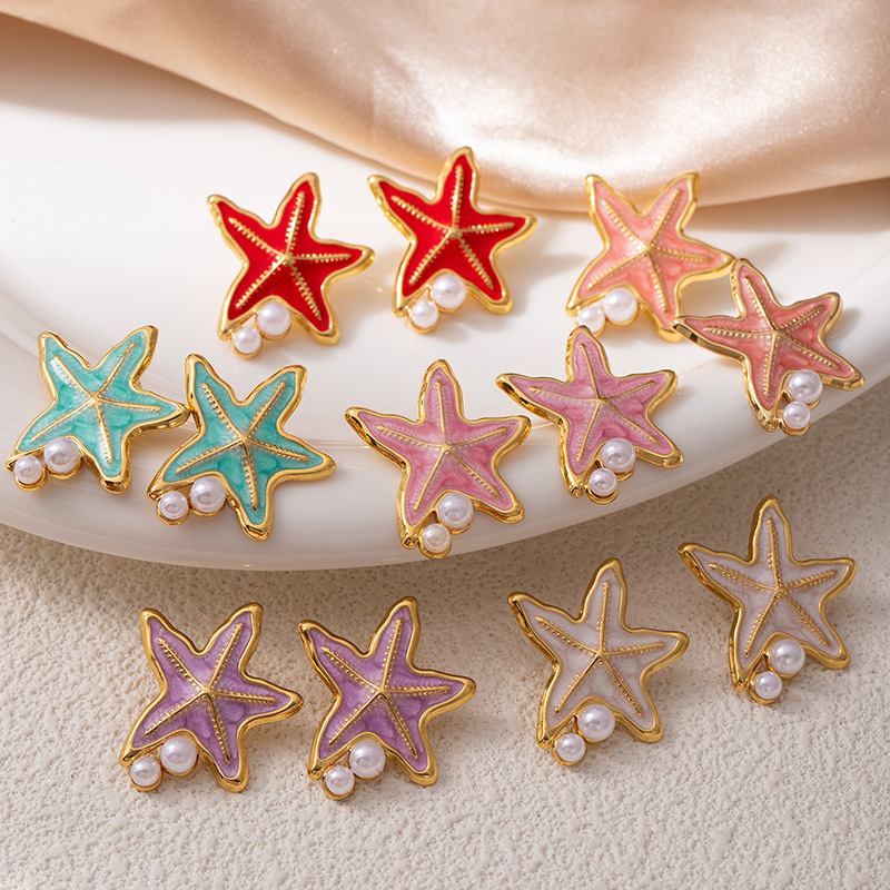 Cross-Border Colorful Oil-Dropping Starfish Mother-Of-Pearl Inlaid Pearl Stainless Steel Earrings for Women Non-Fading Light Luxury Earrings Wholesale