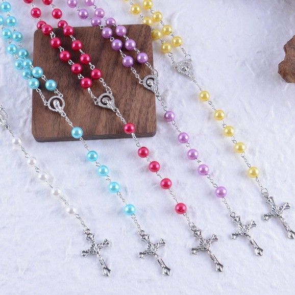 Cross-Border European and American Imitation Pearl Cross Rosary Long Tassel Necklace, Fashionable and Elegant Unisex Sweater Chain