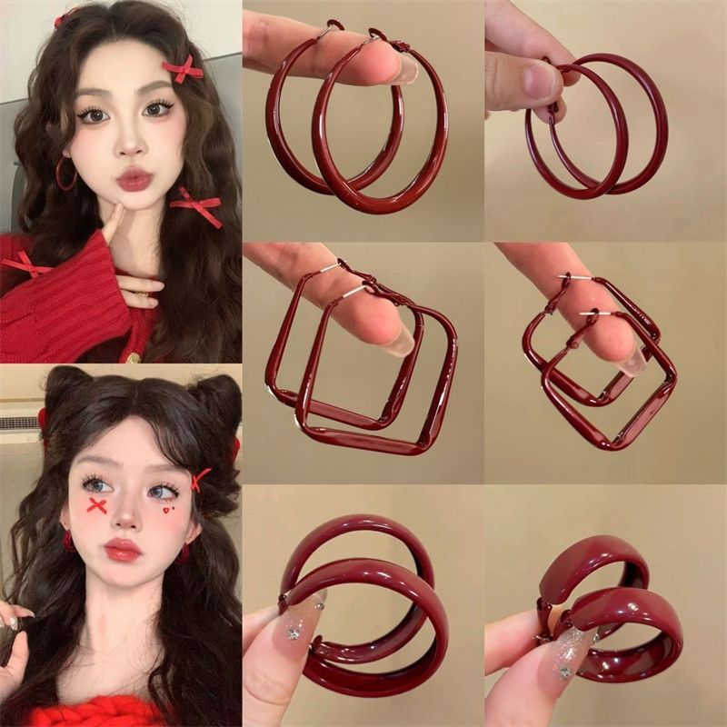 Romantic more than ~ retro Ankora red geometric hoop earrings women ins Hong Kong style temperament high-end white earrings